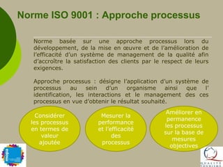 La présentation aborde l'importance de la norme ISO 9001 dans la gestion de la qualité pour les offices de tourisme, en se concentrant sur une approche par processus visant à améliorer la satisfaction des clients. Elle compare la norme ISO, rigoureuse et systématique, avec la démarche MQT, plus souple, en soulignant les enjeux stratégiques liés à leur adoption. Les discussions entre participants permettent d'échanger sur ces enjeux et de mieux comprendre les implications pour les structures touristiques.