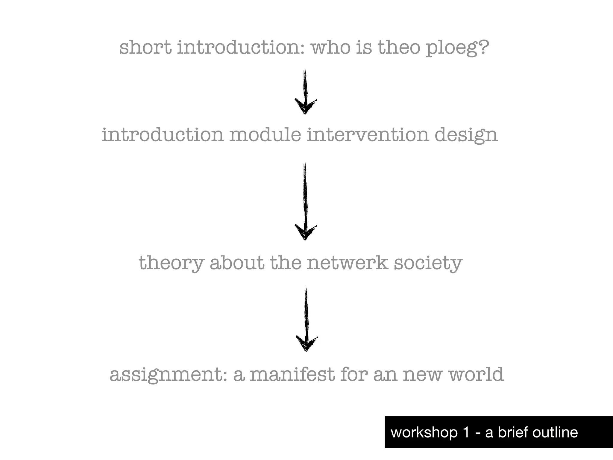 The document outlines an intervention design course led by Theo Ploeg, focusing on the complexities of the network society and media theory. It emphasizes the importance of blending theory and practice in creating interventions that address identified problems in the media landscape. Participants are tasked with envisioning a new societal structure following a hypothetical zombie apocalypse, encouraging them to rethink existing systems and develop a manifest for a new world.