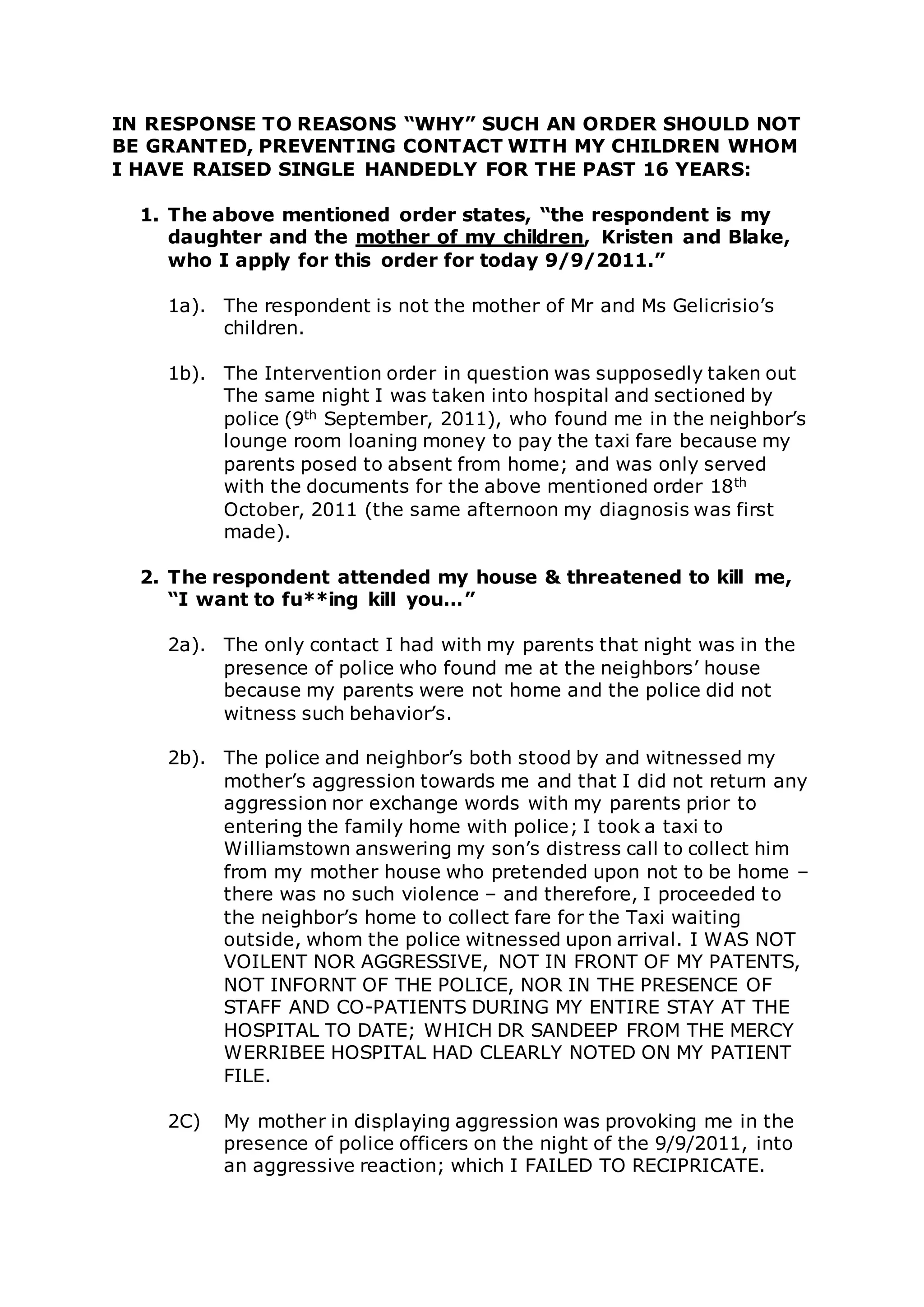 The letter provides a detailed response to the claims made in the intervention order application, asserting that the accusations of threats, aggression, abuse of her children, and mental health issues are false. Gelicrisio contests being deemed a danger and requests to adjourn the current court date to adequately defend herself against the false allegations, noting she is currently involuntarily hospitalized and seeking a second psychiatric opinion.