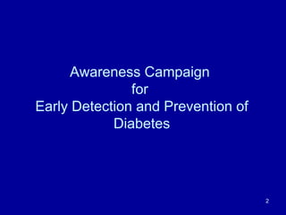 The document outlines a proposed awareness campaign for early detection and prevention of diabetes among minority residents ages 20 and older who are at risk but not yet diagnosed. It aims to reduce mortality, morbidity, and the economic burden of diabetes. The campaign would use the Health Belief Model to increase perceived susceptibility and risks to motivate behavior change. Objectives include developing an advisory committee, recruiting volunteers, evaluating the process, and collecting data on behavior changes and incidence/prevalence pre- and post-campaign.