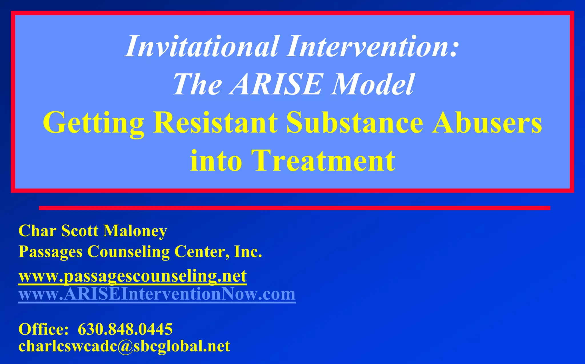 This document discusses invitational intervention and the ARISE model for engaging resistant substance abusers in treatment. It addresses several key points: