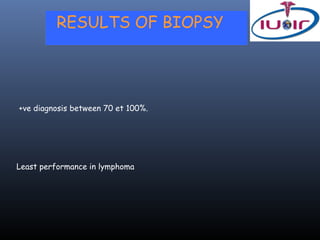 1) Biopsy results being positive 70-100% of the time, with the lowest success for lymphoma.