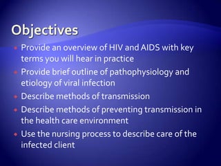 The document provides an overview of interventions for clients with HIV/AIDS. It begins with key terms related to immunodeficiency and HIV/AIDS. It then describes the pathophysiology and etiology of HIV, how it is transmitted, and methods for preventing transmission. Nursing assessments, diagnoses, outcomes, and interventions are outlined with a focus on managing infections, nutritional status, and psychosocial needs. The document concludes with references.