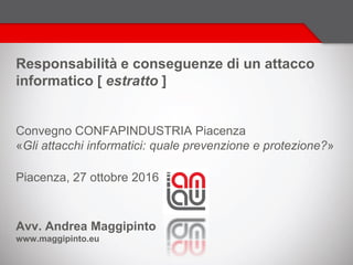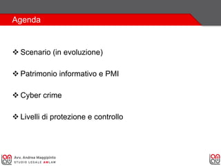 Il documento discute le responsabilità e conseguenze legate agli attacchi informatici e presenta l'agenda digitale dell'UE del 2010, che mira a creare un mercato unico digitale. Viene evidenziato come le PMI siano vulnerabili a vari tipi di cyber attacchi e misconcezioni comuni sulla sicurezza informatica. Infine, si analizzano le leggi italiane riguardanti i crimini informatici e la tutela dei beni intangibili.