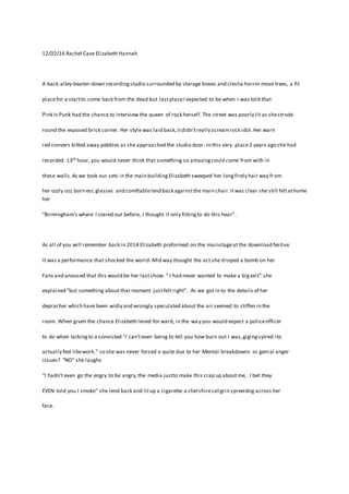 1) Elizabeth Hannah, the queen of rock, was interviewed in a run-down recording studio in Birmingham where she had previously recorded her album 13th Hour.