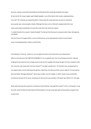 3) Elizabeth is preparing to embark on a massive comeback tour called "Hasbin" starting in August 2016, with 29 venues across Europe and support from acts like The Pretty Reckless and 21 Pilots. She hopes to reconnect with her fans and leave her critics in the dust.