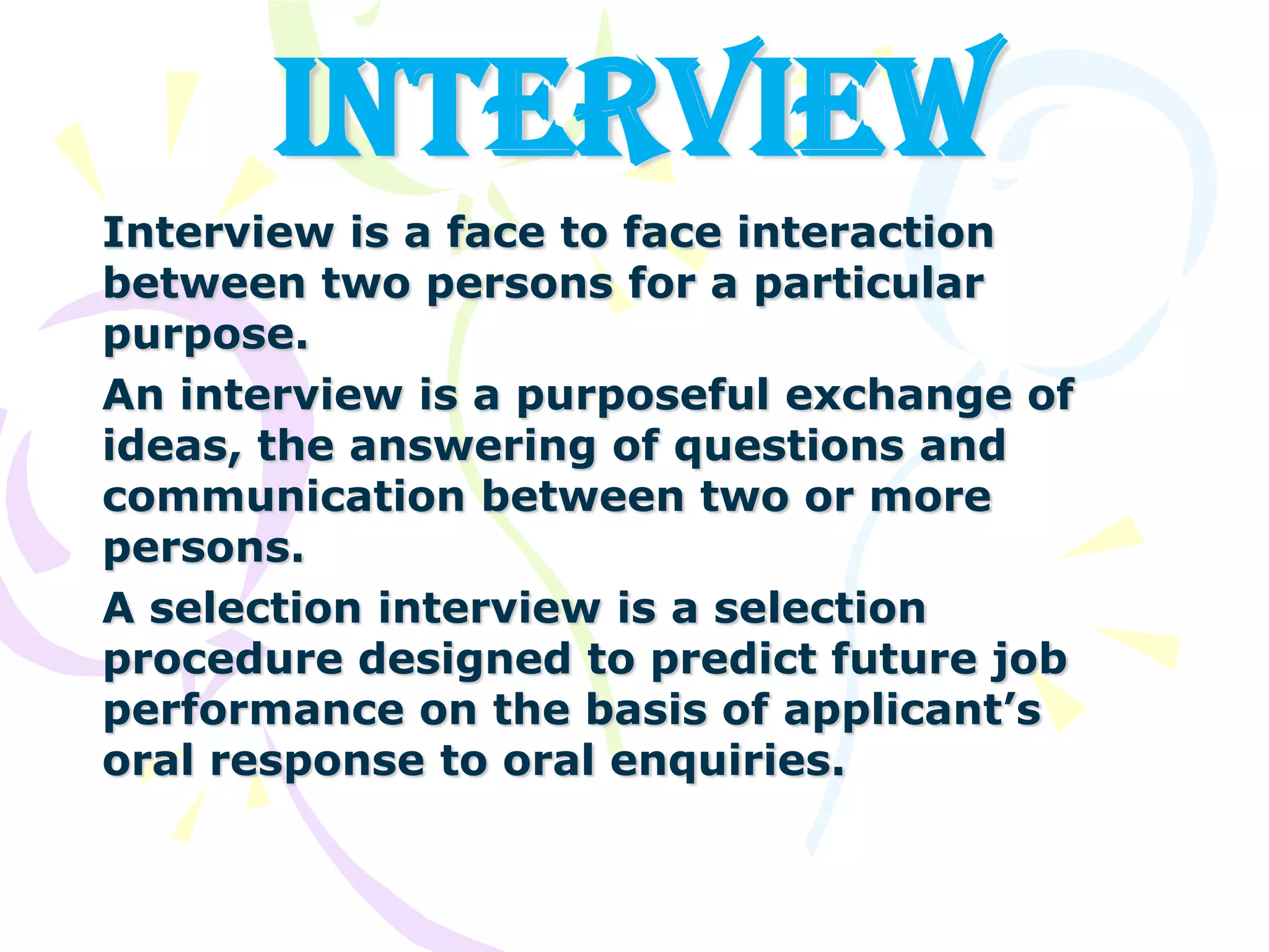 An interview is a face-to-face meeting between two or more people where questions are asked to evaluate a person for a job or potential employment. Interviews can be structured, where questions are predetermined, or unstructured, where questions are more free-flowing. Interviews are used to assess a candidate's qualifications as well as soft skills like communication, problem-solving, and ability to work with others. There are different types of interviews that serve different purposes, such as stress interviews to evaluate performance under pressure or exit interviews for departing employees. Interviews provide useful information for hiring decisions but also have limitations like personal bias that interviewers must be aware of.