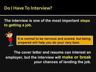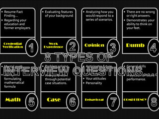 The document provides tips and strategies for effective interviewing. It discusses how to prepare for different types of interview questions, including behavioral and competency-based questions. Examples of common questions are provided. The document emphasizes being prepared with specific stories and examples from your background to demonstrate your skills and qualifications for the role. Proper preparation, a positive attitude, research on the company, and practicing responses are presented as keys to interview success.