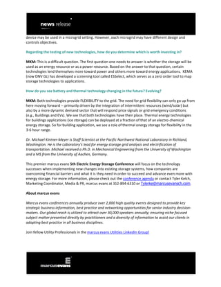 Dr. Michael Kintner-Meyer, a staff scientist at Pacific Northwest National Laboratory, discusses energy storage technology and its role in the energy industry. He notes that safety is now a major focus of energy storage due to past incidents. Storage technologies have also matured over the past decade, with flow batteries becoming commercially viable and better integration of storage mediums. The opening of Tesla's patents may help drive innovation in supply chains and reduce system costs. Testing new storage technologies involves determining their best use as either an energy or power resource. Dr. Kintner-Meyer sees roles for both battery and thermal storage in providing grid flexibility to accommodate more intermittent renewable resources.