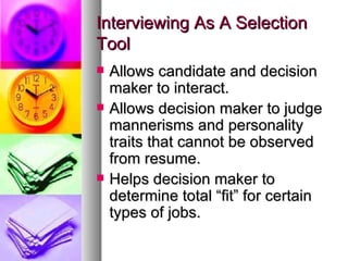 The document provides tips and advice for interview success. It discusses the main types of interviews, how to prepare, what to expect, and best practices during and after the interview. Specifically, it recommends dressing professionally, researching the company and position, preparing answers to common questions, knowing your strengths and how they fit the role, maintaining confidence without arrogance, having a clear message about your value, asking questions of the interviewer, and following up with a thank you after the interview.