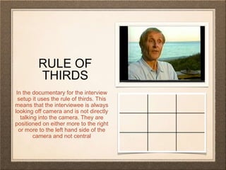 The document discusses several conventions used in documentary interviews, including positioning interviewees off-center following the rule of thirds, using graphics to identify interviewees, capturing subjects in midshot and closeup camera shots, choosing visually interesting backgrounds related to the interview subject matter, and employing cutaways and b-roll footage to help edit the interviews.