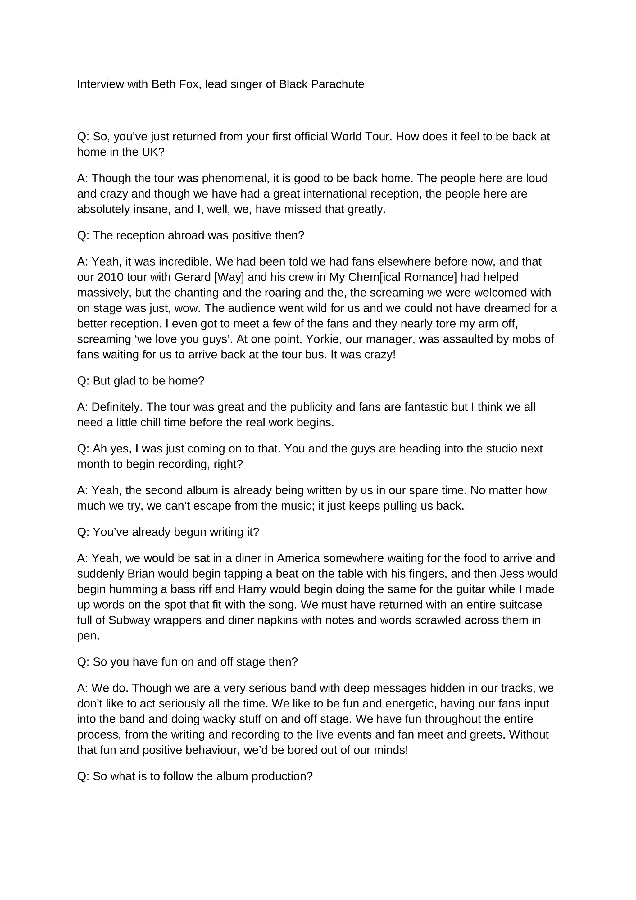 Beth Fox discusses Black Parachute's successful world tour and excitement about returning home to the UK. While the international reception from fans was incredible, with wild crowds chanting and screaming, she admits the band is glad for some downtime before beginning work on their second album. Beth reveals the band has already begun writing songs on napkins while on tour, and that they plan to attend all major UK music festivals in the coming year, including Download, Slam Dunk, Reading and Leeds, before releasing their new album in May or June.