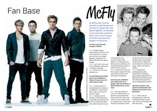 This document summarizes interviews with three McFly fans about the band. Fan 1's favorite member is Dougie Poynter because they feel they have most in common with him. Fan 2 can't pick a favorite as they love each member for different reasons. Fan 3's favorite is Danny because he is the most talented. Fan 1 cites "Ignorance" as their favorite song for its unique style. Fan 2 loves the old b-sides and cites the acoustic version of "No Worries" as encapsulating McFly's sound. Fan 3's favorite is "I've Got You" as it was the first song they heard and made them fall in love with the band. Fan 1 says each member has influenced them