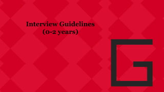 The document outlines the interview process for candidates with 0-2 years of experience at GreedyGame, detailing each step including a take-home problem statement, telephonic interviews, and face-to-face meetings. It emphasizes the importance of not only technical skills but also cultural fit within the organization. Candidates will receive updates within specified timelines throughout the process and can contact HR with any questions.