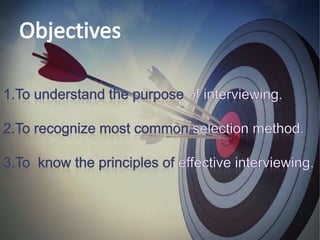 The document provides tips and statistics about effective interviewing. It states that 36% of interviewers look for multitasking skills, 31% initiative, and 21% creative thinking. It also notes that 47% wouldn't hire someone with little company knowledge, 33% decide within 90 seconds, and 50% may eliminate due to dress, actions or entrance. The document outlines developing structured interview guides, preparing for interviews, involving staff, and ensuring reliability and validity by evaluating if applicants can and will perform and fit the culture. It emphasizes the importance of the interviewer consistently evaluating needs, goals and responses of interviewees.