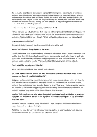This interview summarizes an interview with actress Ashleigh Rivers about her upcoming role in the new film "Soulless." She discusses enjoying time off to relax with family and friends after long filming schedules. Rivers also talks about enjoying working with co-star Gerard Butler and staying true to the source material from the book series. She encourages fans to see the film when it is released in theaters on June 14th.