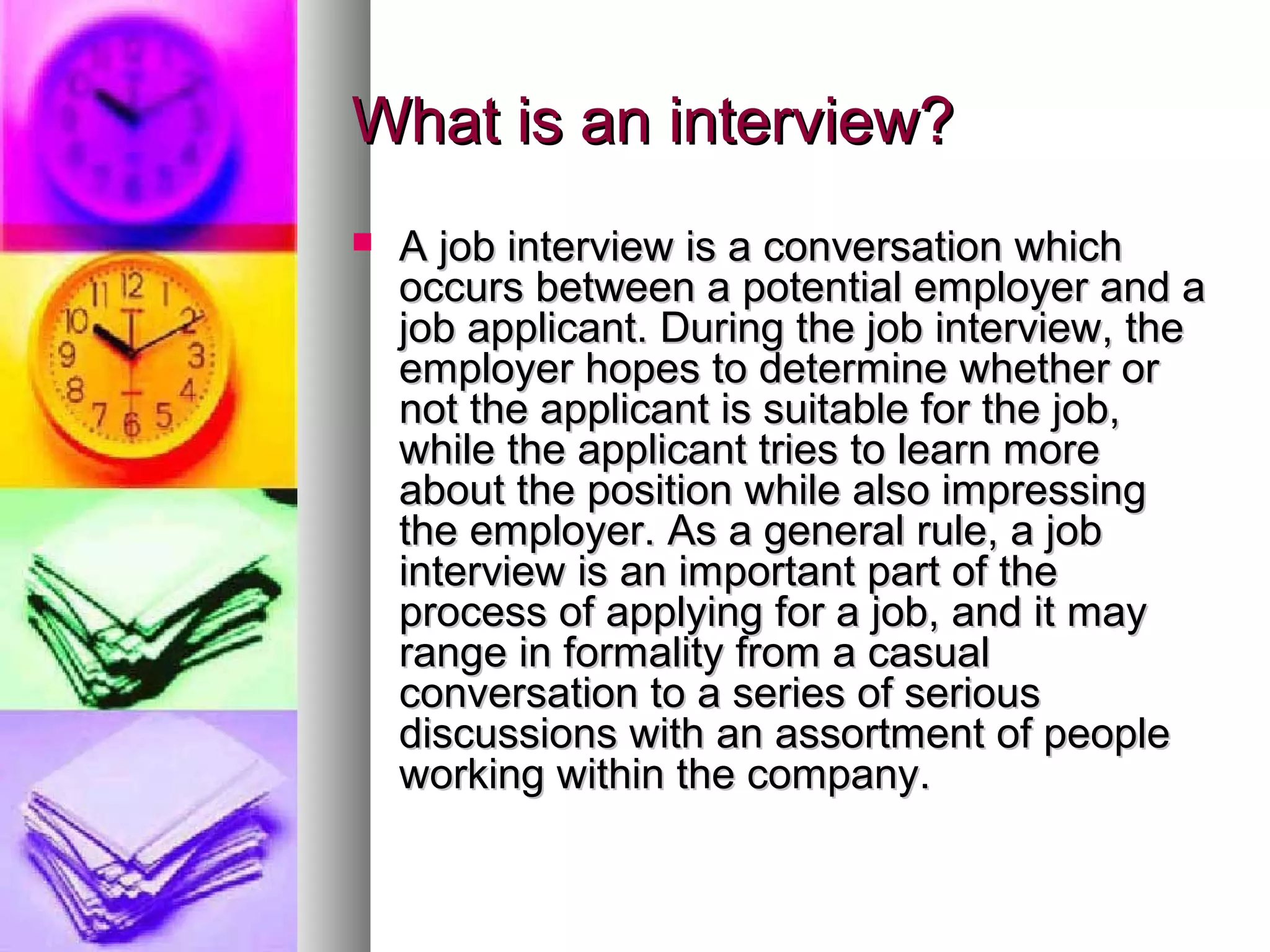 The document discusses job interviews, providing information on what an interview is, different types of interviews, common questions asked in interviews, how to prepare for an interview, and tips for answering interview questions. It notes that a job interview allows an employer to determine if an applicant is suitable for a position while letting the applicant learn about the job. Different types of interviews mentioned include formal, phone, and panel interviews. Common questions, preparation steps, and ways to answer tricky questions are also outlined.