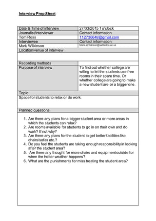 The interview is scheduled for March 27th at 1pm between journalist Tom Ross and Mark Wilkinson from Salford Community College. The purpose is to determine if the college is willing to let students use empty rooms during their spare time or make a new, larger student area. Planned questions focus on any plans for expanding student space, availability of rooms for individual work, potential improvements to furniture and equipment, student responsibility, and consequences for misusing areas.