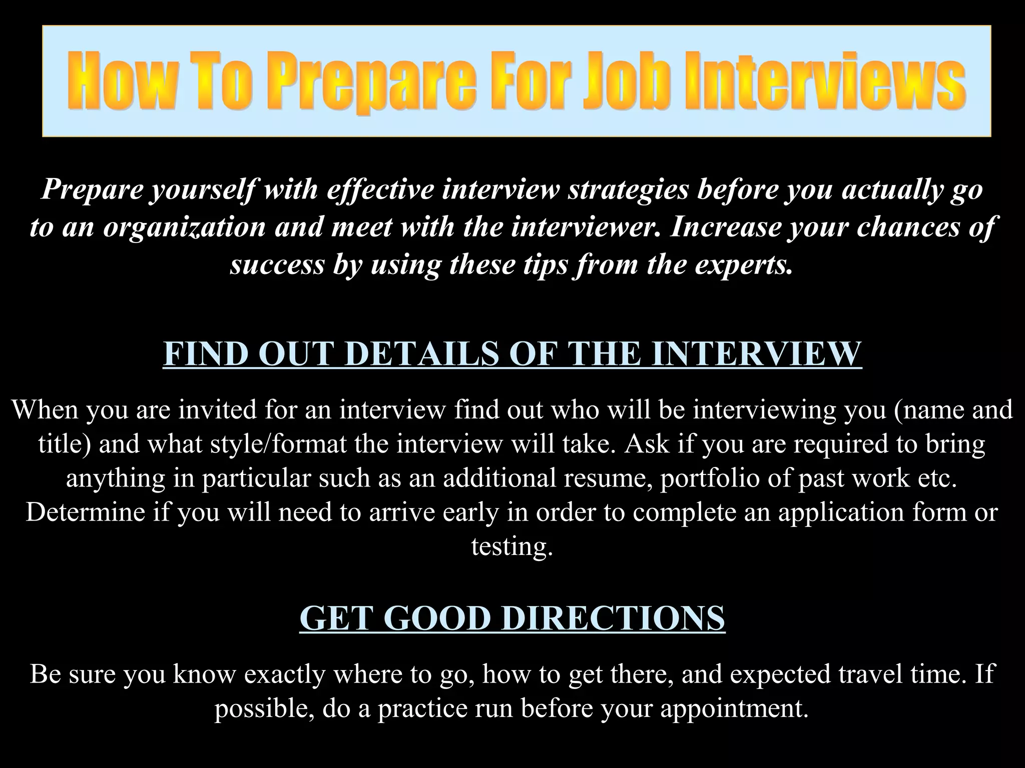 The document provides tips and strategies for preparing for and excelling in a job interview. It discusses researching the organization, practicing interview skills like handshakes and making eye contact, dressing appropriately, and preparing responses to common interview questions. The tips include arriving early, maintaining a positive attitude, having copies of relevant documents, and focusing the discussion on one's strengths, qualifications, and fit for the role. Overall, the document emphasizes the importance of thorough preparation to make a strong first impression and clearly communicate one's suitability for the position.