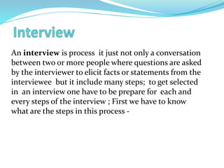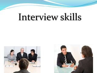 The document outlines essential interview skills, emphasizing preparation for each stage of the interview process such as grooming, body language, and techniques for answering questions. Key points include the importance of body language in non-verbal communication, strategies for building rapport, and common interview questions with suggested ways to respond. It also discusses alternatives to saying 'I don't know' and offers detailed techniques for effectively answering questions during interviews.