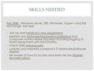 This interview presentation outlines the skills and goals of a junior IT technician position. The key skills needed include experience with Windows server, SBS, VMware, Hyper-V and Microsoft Exchange. Important goals are to promote the helpdesk as the primary IT contact, ensure all problems are documented and resolved in a timely manner, and maintain efficient IT support call resolution.
