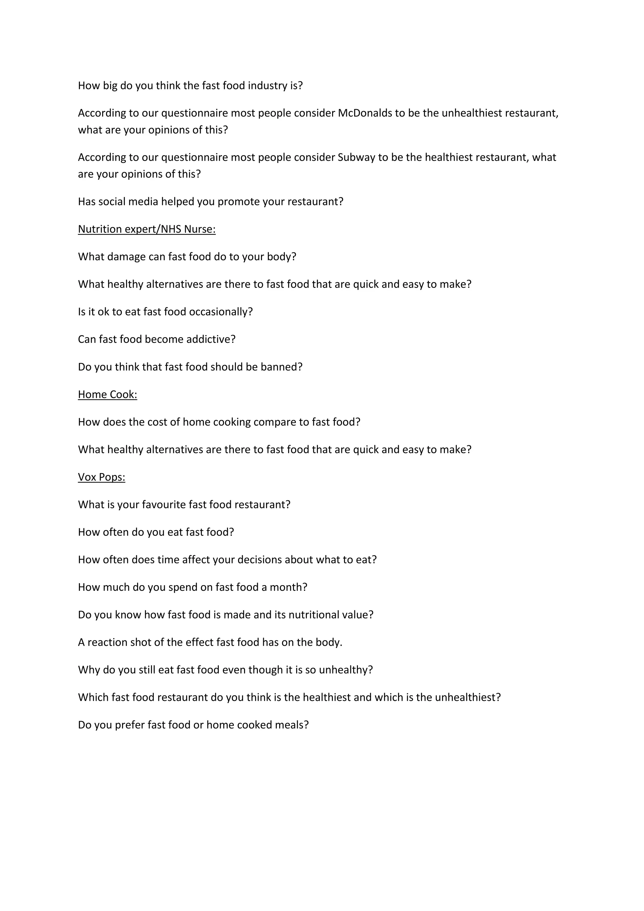 The document contains interview questions about fast food for various groups including employees and managers of fast food restaurants, nutrition experts, home cooks, and customers. The questions cover topics such as popular menu items and times of year, the nutritional quality and preparation of fast food, the impact of fast food on health and society, healthy alternatives to fast food, and opinions on which fast food restaurants are considered healthiest and unhealthiest.