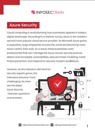 The document provides an overview of Microsoft Azure's security features and the growing demand for Azure security professionals amid a shifting digital landscape. It includes common interview questions and answers related to Azure security concepts such as network security groups, data encryption, and threat protection strategies. Additionally, it promotes a training course to prepare candidates for Azure security roles and enhance their understanding of the platform's capabilities.