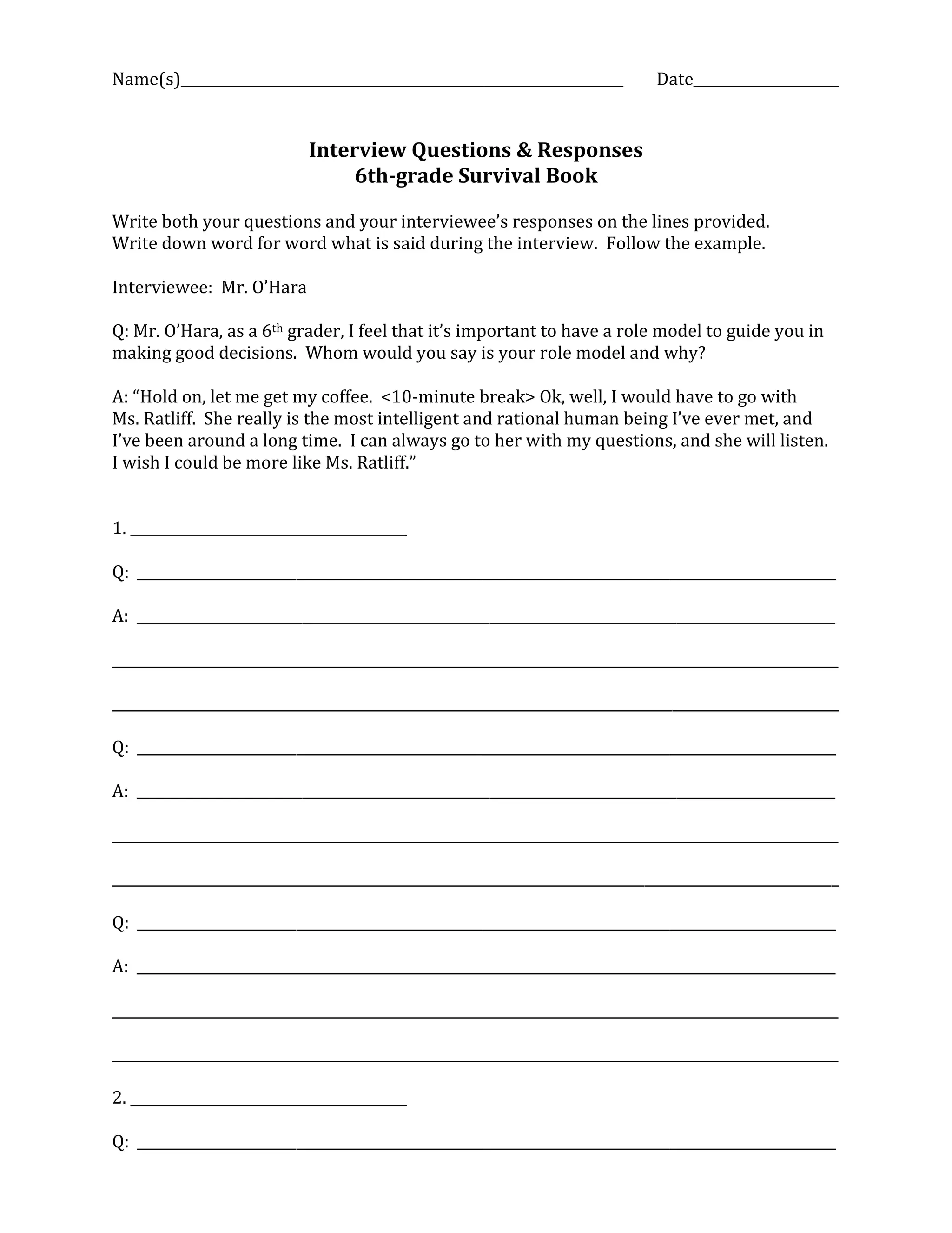 The document provides instructions and space for a 6th grader to conduct interviews with three people by writing down their questions and the interviewees' responses. It includes an example interview with Mr. O'Hara, who says his role model is Ms. Ratliff because she is intelligent, rational, and always listens to him. The rest of the document consists of blank lines for the student to fill in their own interview questions and the responses from three additional interviews.
