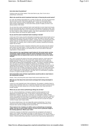 - Cohen sees the social investment bank playing a role in funding the full spectrum of social investment from philanthropy to mission-driven businesses, including by investing in social venture funds and supporting lenders to social sector organizations.