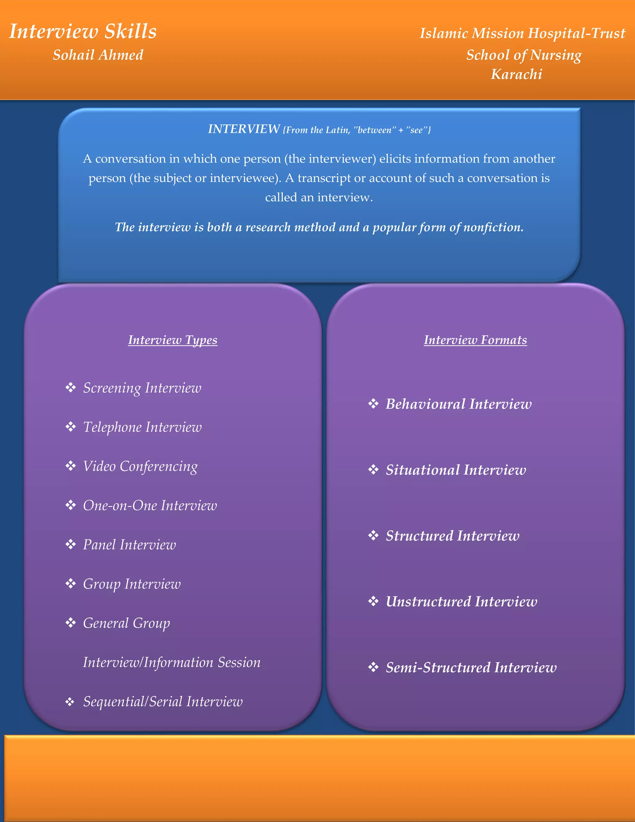 This document provides information about different types of interviews, interview formats, tips for interviewers and interviewees. It discusses screening interviews, telephone interviews, video conferencing interviews, one-on-one interviews, panel interviews, group interviews, behavioral interviews, situational interviews, structured interviews, unstructured interviews, semi-structured interviews, case interviews, testing/assessments, tips for appearing in an interview including dress code, being on time, body language, greeting the interviewer, questions to ask, what to provide the interviewer, and closing/following up after the interview.