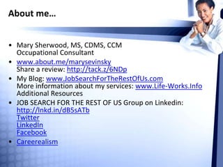 The document provides interview preparation tips focusing on the importance of relaxation before the interview. Key points include ensuring you are well-prepared and well-rested, while engaging in positive activities to boost confidence. Mary Sherwood shares her expertise and resources to help candidates feel calm and collected on the day of their interview.