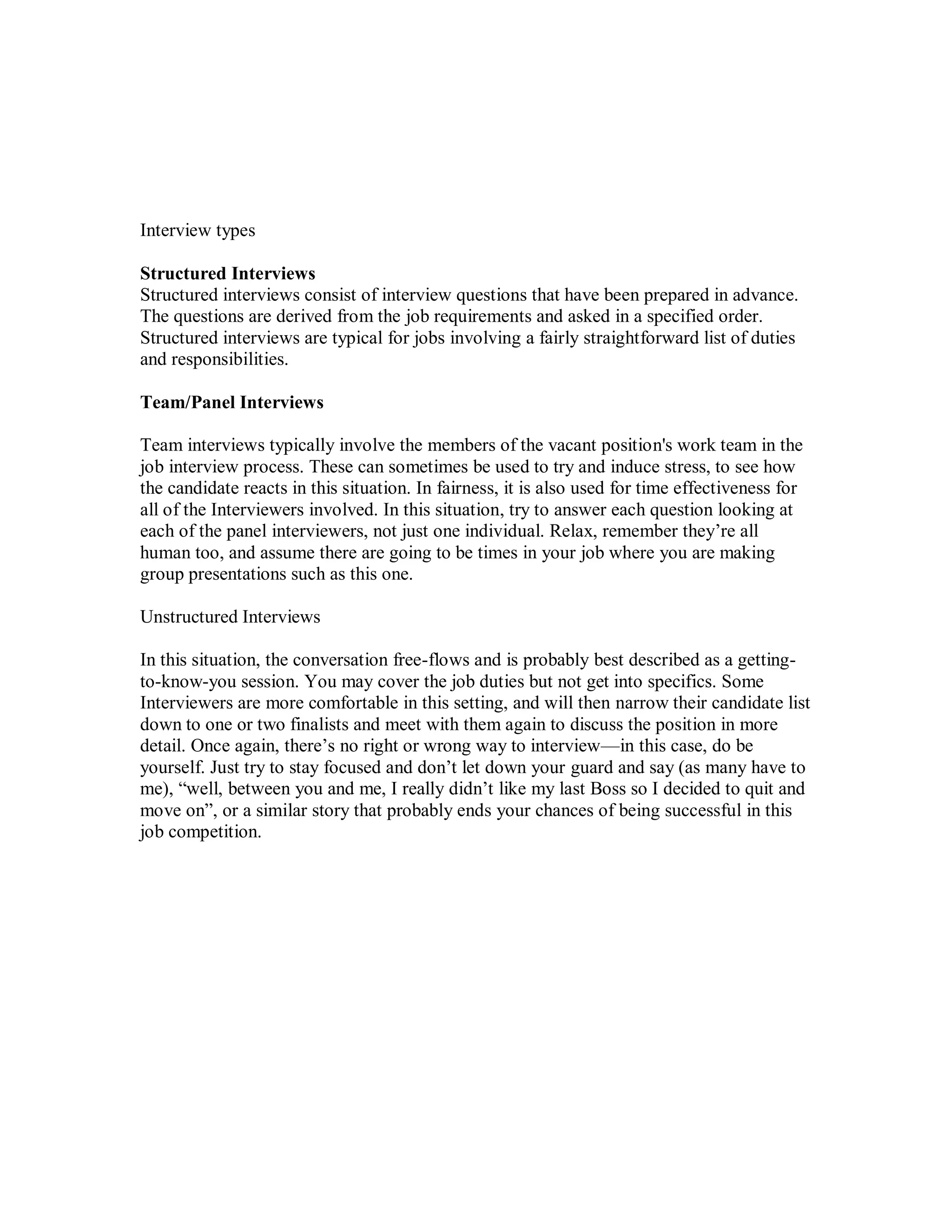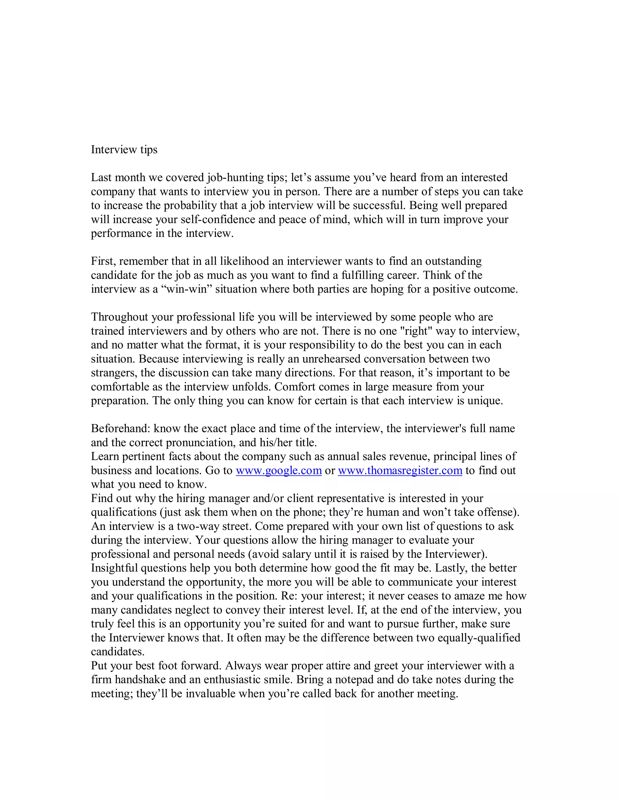 This document provides tips for job interviews. It recommends preparing for interviews by researching the company and position. During the interview, present yourself confidently and come prepared with questions to ask. Common interview questions focus on work history, goals, strengths, and availability. Behavioral questions assess key competencies through work examples. After the interview, ask about next steps and emphasize your fit for the role. Preparation and enthusiasm can help lead to a successful interview.