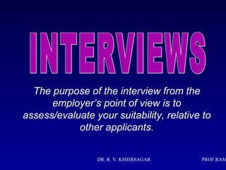 The document provides tips for preparing for and participating in a job interview. It discusses assessing the interviewer's perspective, preparing resume/CV materials, researching the employer, practicing effective communication skills like eye contact and handshakes, being punctual and appropriately dressed, anticipating common questions, and maintaining a positive attitude. The goal is to evaluate the applicant's suitability for the position relative to other candidates.