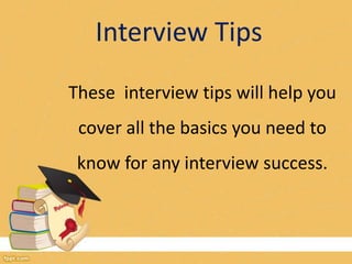 This document provides tips for having a positive interviewing experience. It recommends preparing your outfit in advance, getting good rest the night before, planning your route to ensure you are not late, and practicing common interview questions. During the interview, it advises dressing appropriately, being prepared to discuss your resume, building rapport with the interviewer, avoiding cluelessness or nervousness, keeping phones off, and explaining how your skills match the job. After the interview, it suggests shaking the interviewer's hand and thanking them for their time.