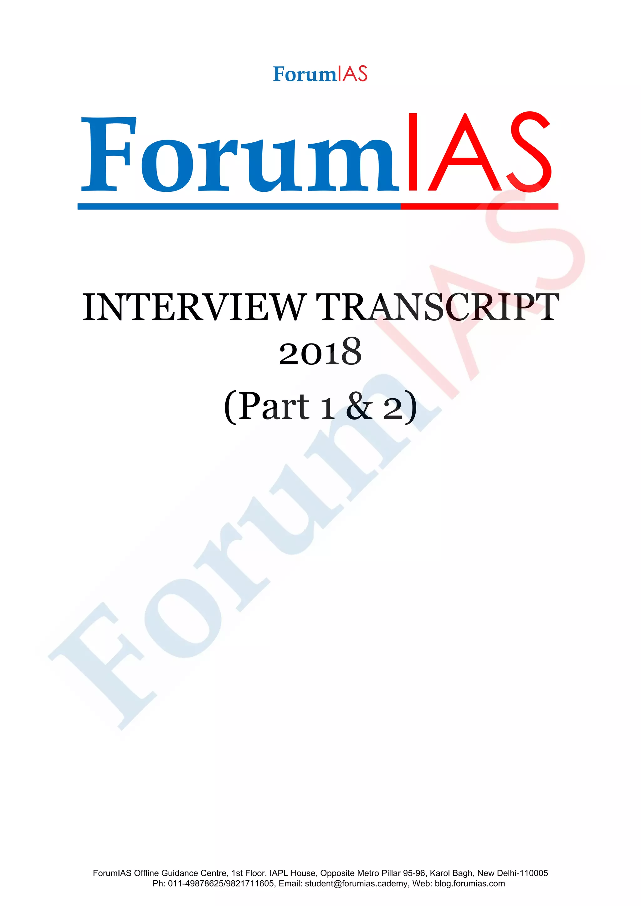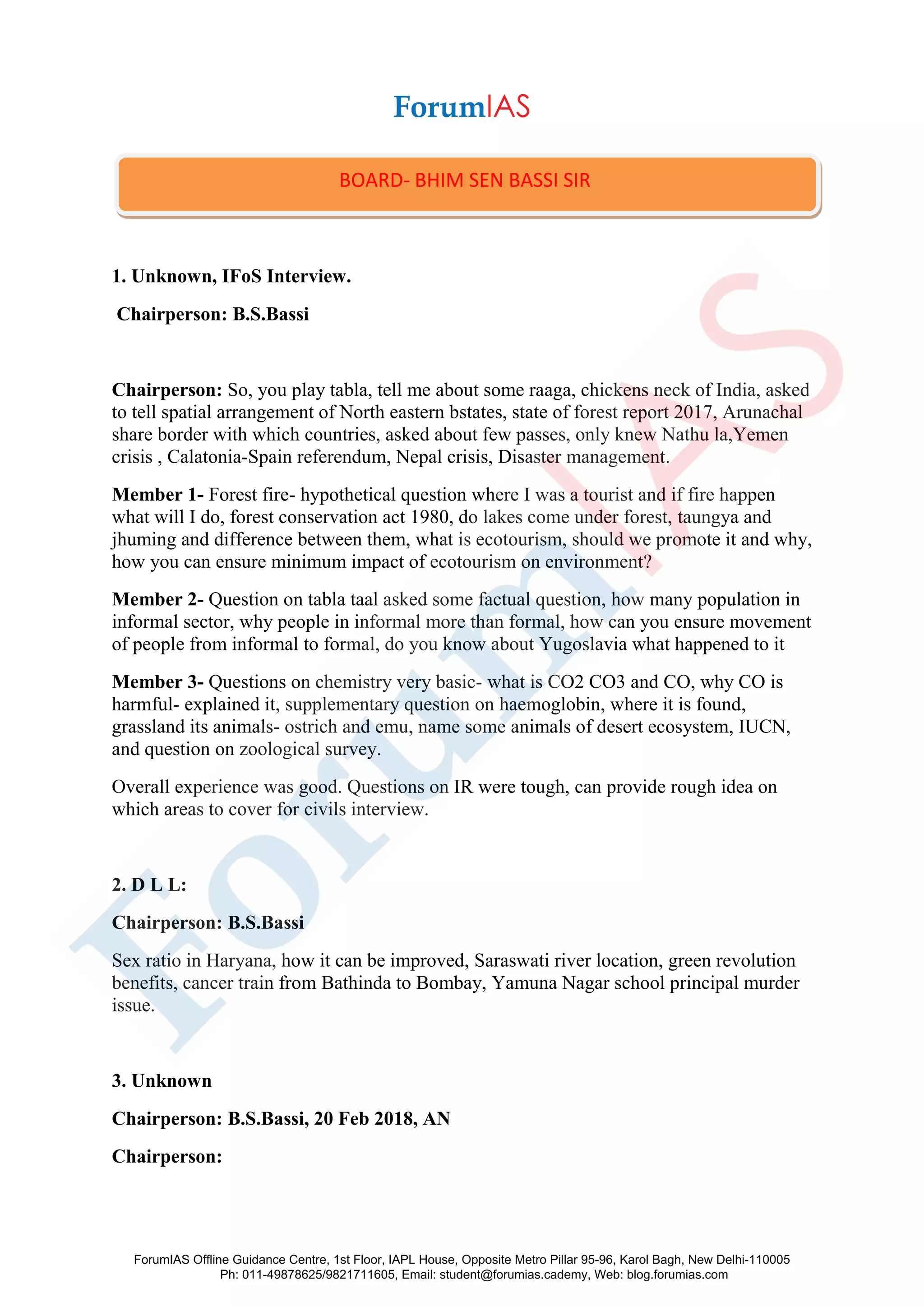 The document contains transcripts from interviews of 6 individuals for the Indian Forest Service conducted by the panel headed by B.S. Bassi. The transcripts provide a high-level overview of the questions asked by the panel members in each interview, which covered a wide range of topics including history, geography, current affairs, science, and hypothetical scenarios. The interviews aimed to assess the candidates' subject knowledge and ability to think on their feet.