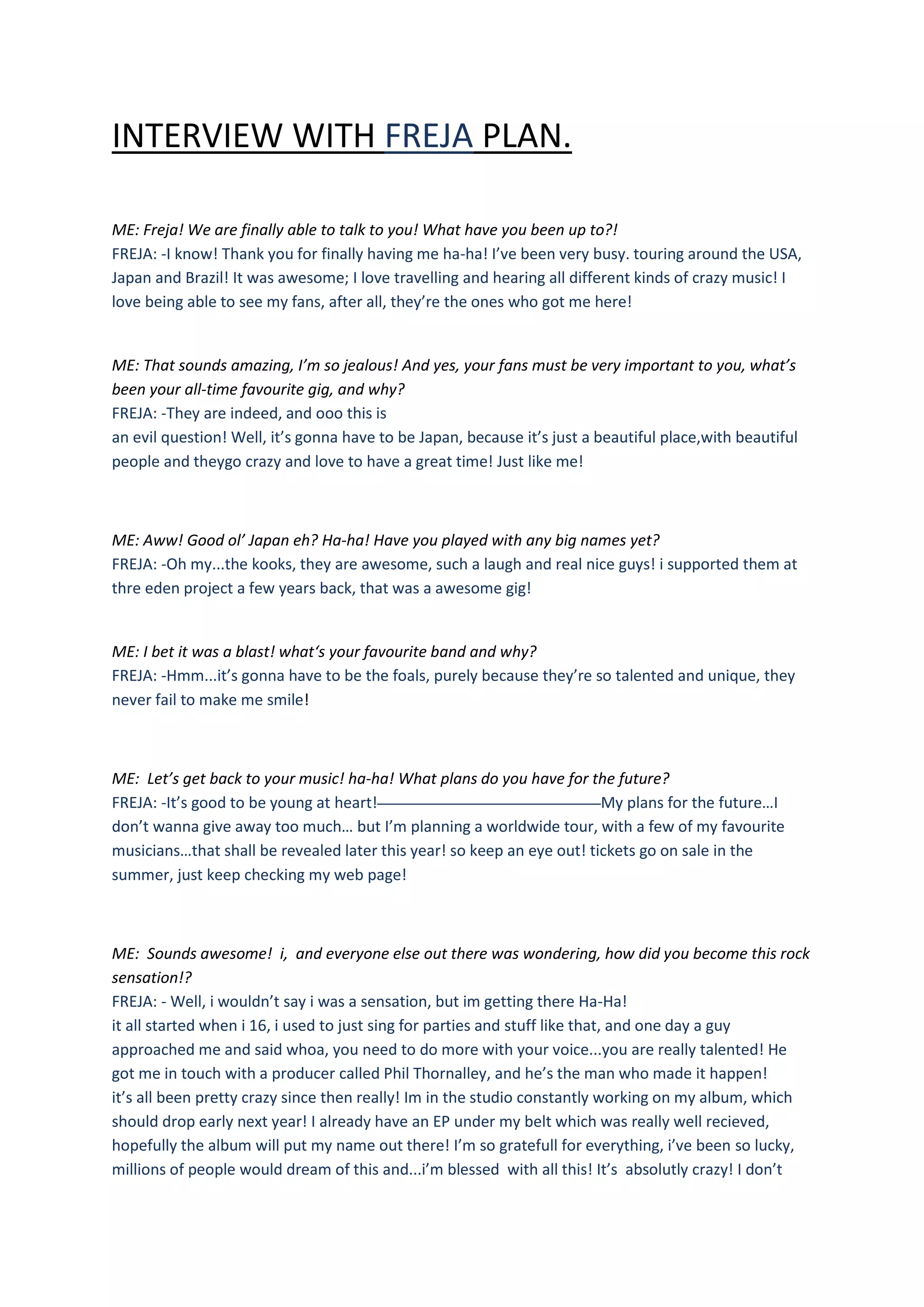 Freja has been touring around the US, Japan, and Brazil, enjoying traveling and performing for fans. Her favorite concert was in Japan because of the beautiful scenery, people, and energetic fans. She has opened for bands like The Kooks and enjoys The Foals for their talent and uniqueness. Freja is planning a worldwide tour later this year with some favorite musicians. She got her start singing at parties at age 16 and was discovered by a producer who helped launch her career. Her debut EP was well received and her first album will be released next year. Freja is grateful for her success and wants to thank fans for their support.