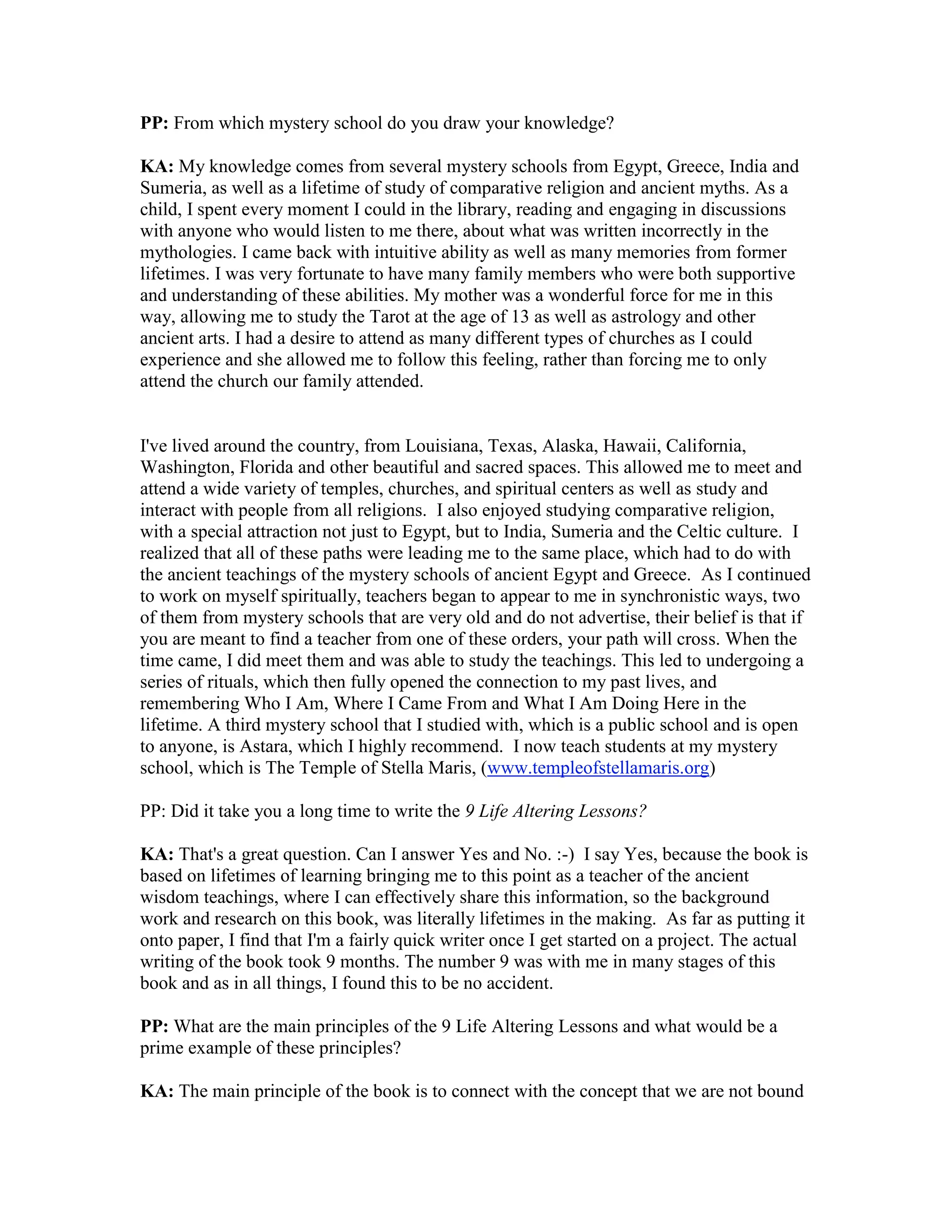 This document contains an interview with Kala Ambrose about her book "9 Life Altering Lessons". In the interview, Kala discusses the main principles behind the lessons in her book, which focus on connecting with higher dimensions and realizing our unlimited potential. She draws from her study of various mystery schools over lifetimes to uncover ancient wisdom teachings. Kala explains that the lessons build upon each other to help the reader discover who they truly are at the soul level and understand how their thoughts shape their reality.