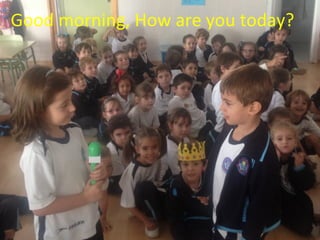 The document contains an interview with questions about a person's name, how they are feeling today, what the weather is like, their favorite color, if they like jumping, and closing thank you statements. The interviewer asks the person their name, how they are feeling, about the weather, and their favorite color. Additional questions are asked about if they like jumping, with thank yous to close the interview.