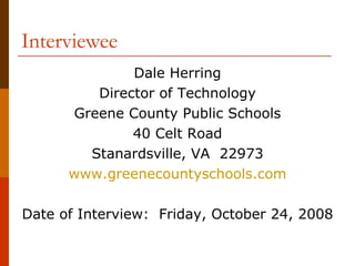 The interview with Dale Herring, Director of Technology at Greene County Public Schools, highlights the importance of technology integration in education for enhancing student achievement and engagement. The school emphasizes professional development and community support, aligning technology usage with strategic goals to ensure accessibility and teacher buy-in. Current initiatives include the iPod project for language learning and the use of interactive technology like mimio boards and Kindles to foster interactive and engaging educational experiences.