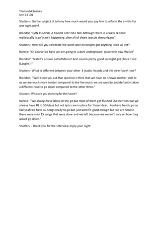 The Killers won Best UK Festival Headline Act of 2014 and were being interviewed by Shutters magazine. Brandon Flowers thanked Shutters for helping launch their career by featuring them in an article years ago. Ronnie said winning awards is always great but being chosen to perform among so many talented musicians is an honor itself. When asked about their favorite award, Ronnie said their two BRIT awards stand out. Brandon praised Johnny Marr's musical talents and influence on him. The band said they would celebrate their award by going out with Paul Weller. Brandon noted their new album shows a more tender side compared to their usual live sound.