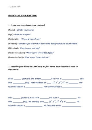 This document provides instructions for students to interview their partner and ask them questions about their name, age, nationality, hobbies, birthday, favorite subject, and favorite food. It then instructs students to describe their partner without using their name, having other students try to guess who they are describing based on the details provided.