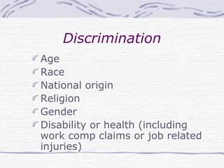 This document provides guidance on conducting legal and effective job interviews. It outlines important topics like avoiding discrimination, asking appropriate questions, screening applicants, documenting the interview, developing different types of questions, and structuring the interview. Employers are advised to prepare well, ask job-related questions consistently, document interviews factually, and make hiring decisions solely based on qualifications for the open position.