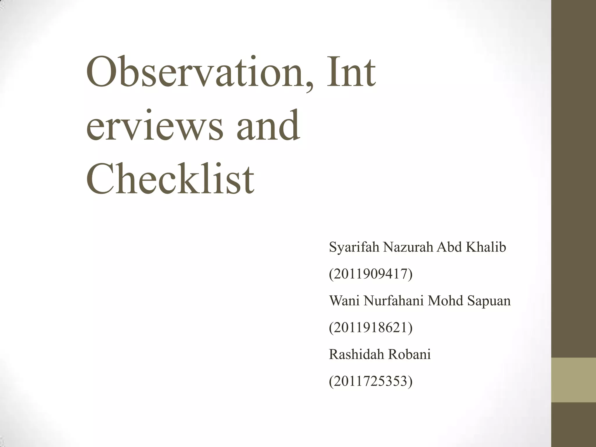 The document discusses observation, interviews, and checklists as qualitative research methods. It provides details on: