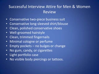 The document provides guidelines for proper interview attire and conduct for both men and women, including dressing professionally and conservatively, being well-groomed, and bringing relevant materials like a portfolio. It also outlines what to expect in an interview, such as common questions, and advises preparing through practice. The document stresses arriving early, shaking hands, making eye contact, and following up after the interview.