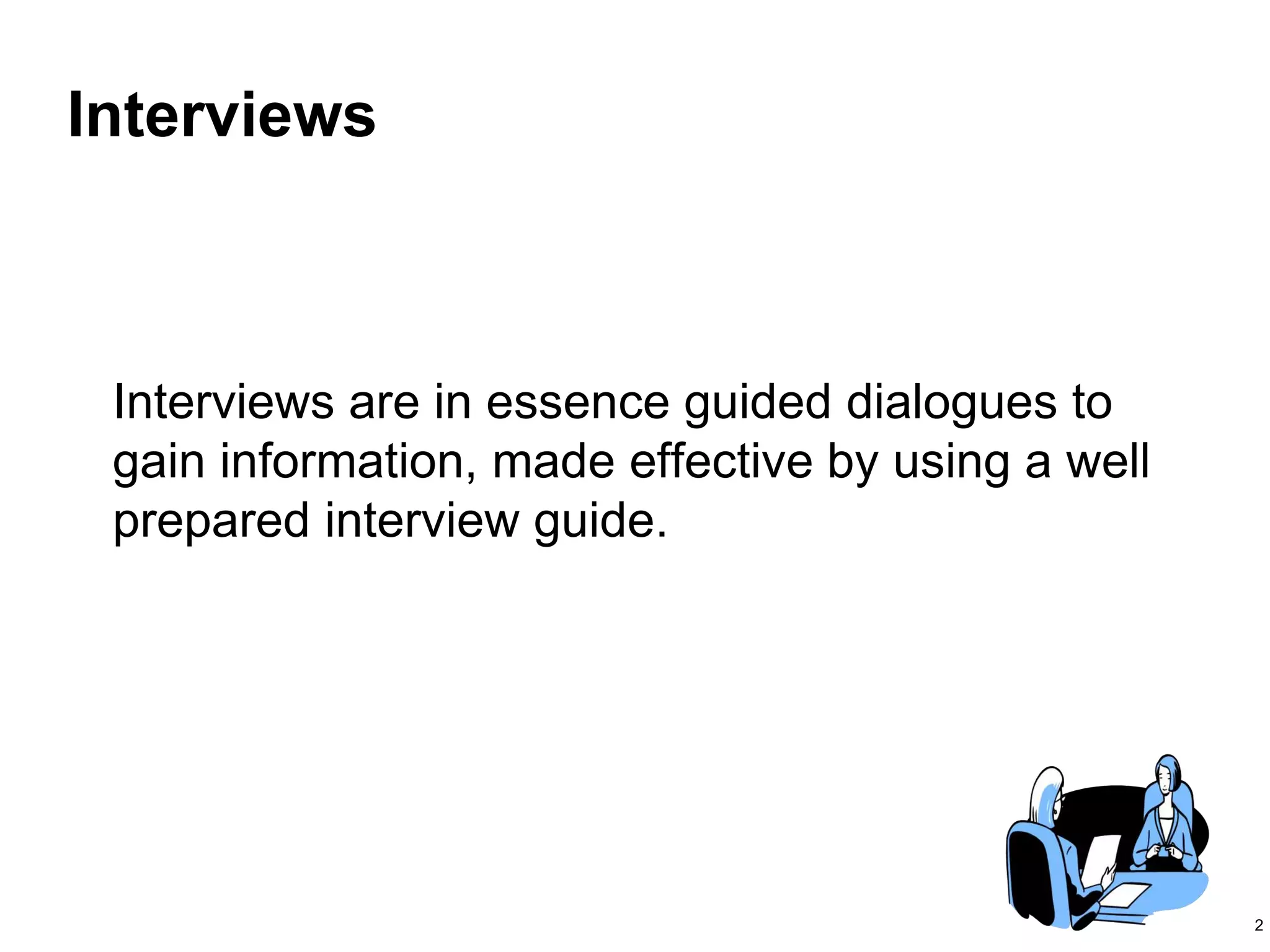 The document provides guidance on conducting effective interviews. It discusses preparing well in advance with an interview schedule and guide to ensure interviews stay focused. The three key steps are preparation, execution, and review. During execution, interviewers should listen actively, ask open and closed questions, and adjust their style based on the interviewee. After, they should write up structured interview notes for review and comparison. The goal is to gain rich information through well-structured guided dialogues.
