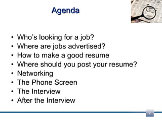 The document summarizes tips for job seekers on conducting an effective job search including where to find job postings, how to write a good resume, networking, interviewing, and following up after interviews. Key points covered include using impact statements on resumes, only using a one page resume for entry level roles, networking accounting for 75% of jobs, using company research to prepare for interviews, and negotiating salary and benefits before accepting an offer.