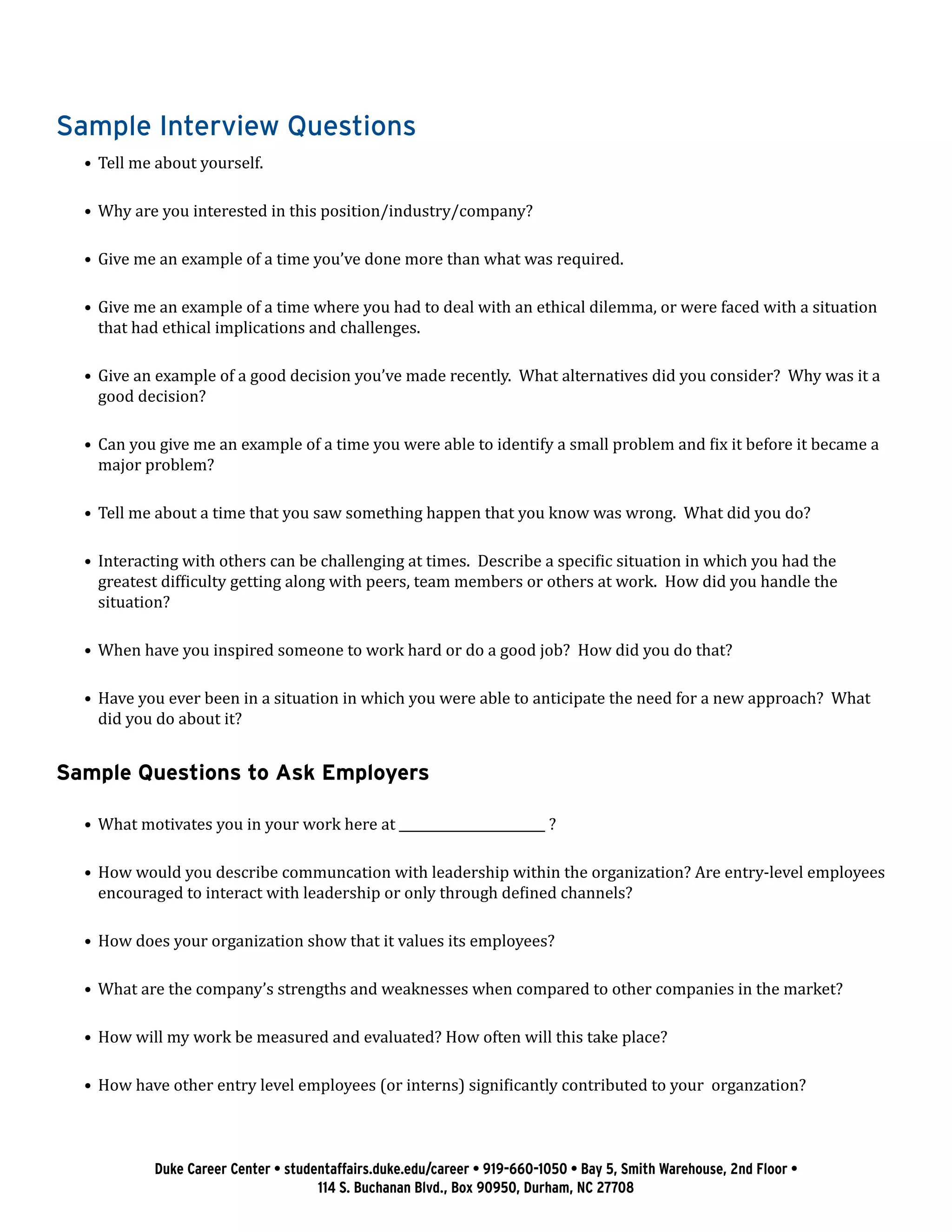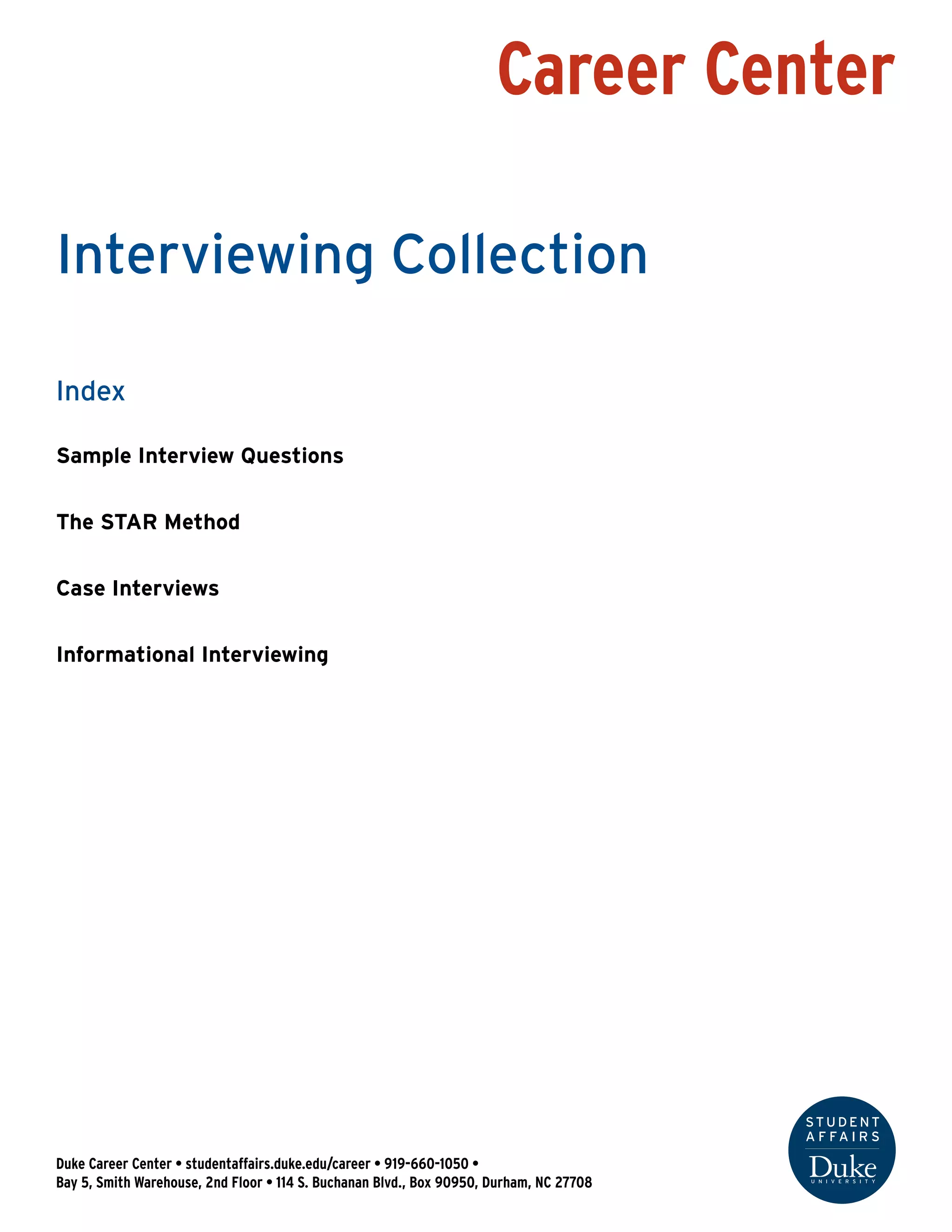 This document from the Duke Career Center provides resources and guidance for interview preparation. It includes sample interview questions, an explanation of the STAR method for answering behavioral questions, information on case interviews, tips for informational interviewing, and how to develop an effective 30-second introduction. Key points covered include highlighting relevant experiences and accomplishments, being able to provide specific examples when answering questions, and focusing the introduction on benefiting the employer.