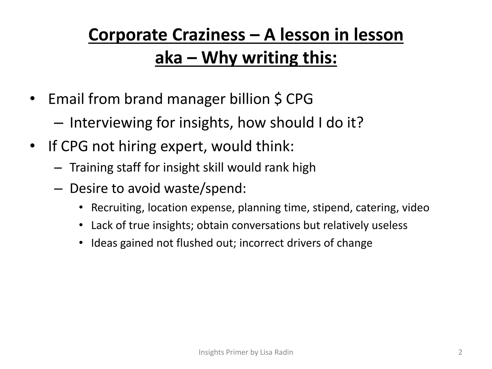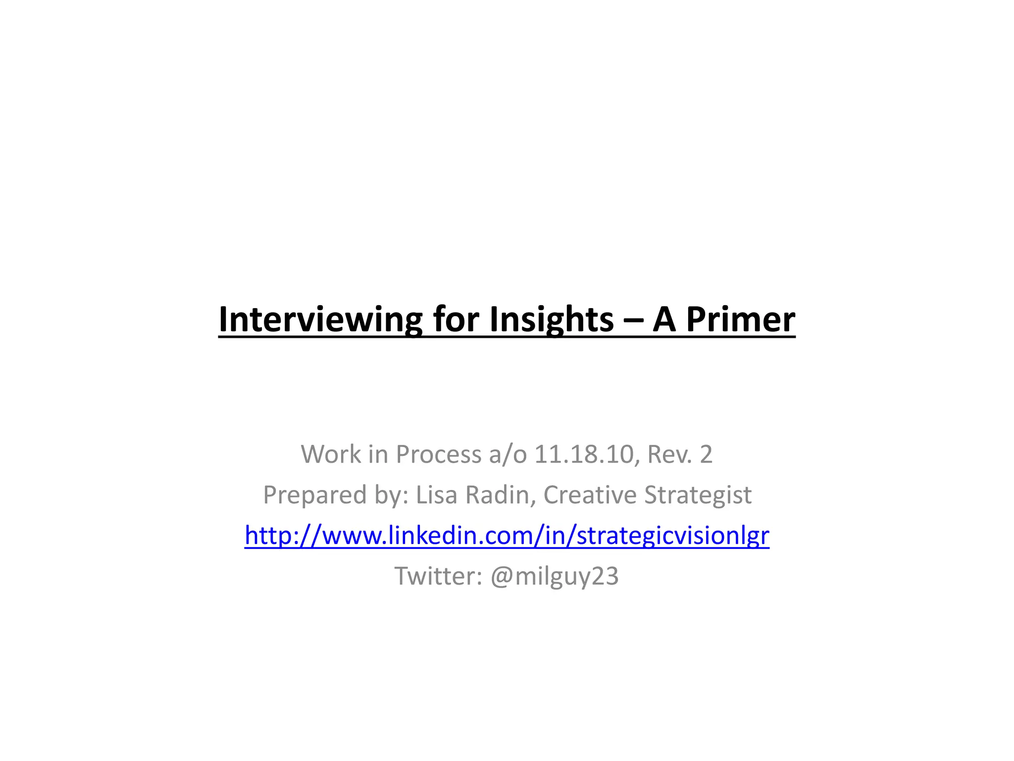 This document provides a primer on conducting interviews to gain consumer insights. It outlines 16 lessons for effectively understanding consumers' thoughts, feelings, and behaviors related to categories and brands. The key lessons are to listen without judgment, let consumers define terms in their own words, make an emotional connection, and dig deeper for underlying motivations beyond surface opinions. The goal is to uncover both logical and illogical consumer truths that can provide opportunities for innovation.