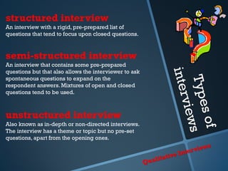 Interviews in qualitative research can take three forms: structured interviews use a rigid list of closed questions; semi-structured interviews contain some pre-prepared questions as well as spontaneous follow-ups; and unstructured interviews have a theme but no preset questions beyond broad opening ones, allowing for a flexible in-depth exploration of the topic.