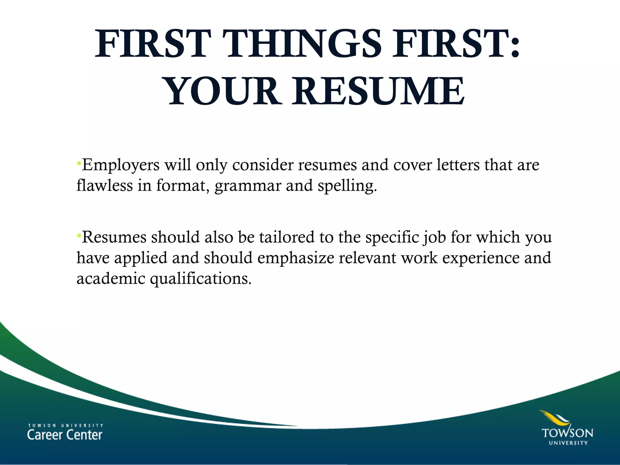 This document provides guidance on interviewing skills. It discusses preparing a resume and cover letter tailored to the specific job. When invited to an interview, the candidate should research the organization and prepare by practicing answers to common questions. During the interview, the candidate should dress professionally, make eye contact, ask questions, and send a thank you note afterwards. Key tips include having examples ready that illustrate skills and strengths, being prepared to discuss weaknesses, and asking questions to determine if the role is a good fit. The overall message is that preparation and practice are important to interview successfully.